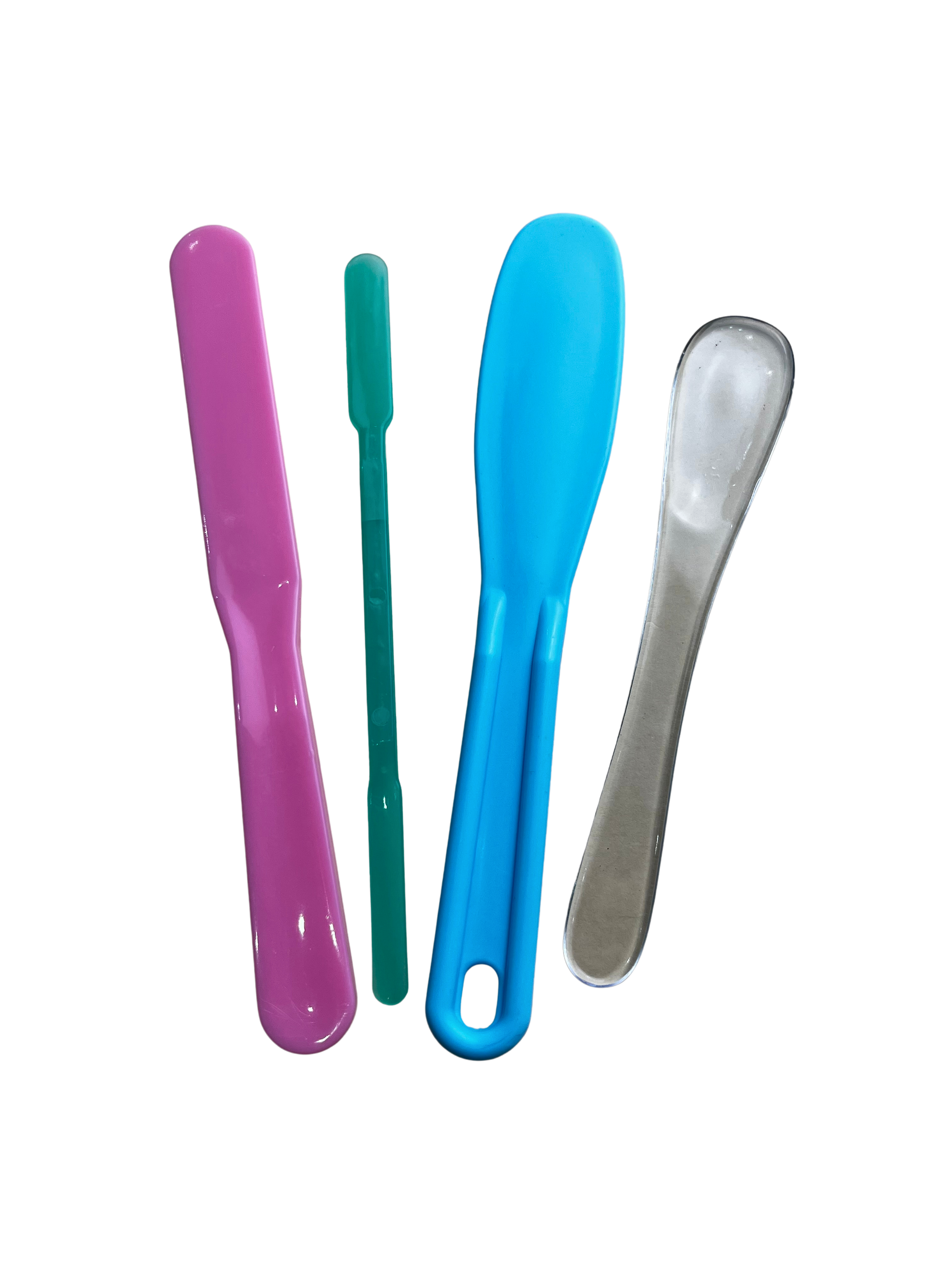 Conjunto de espátulas plásticas para mistura e aplicação de cremes e tinturas para procedimentos estéticos. Espátula espanhola, espátula dupla, espátula anatômica e espátula reta.