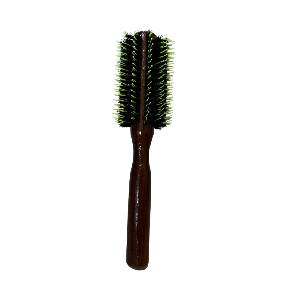 Escova redonda, com cabo em madeira, cerda em nylon 6.6 e cerdas naturais. Ideal para alisar os cabelos em casa ou no salão. Pode ser submetida ao calor do secador.
