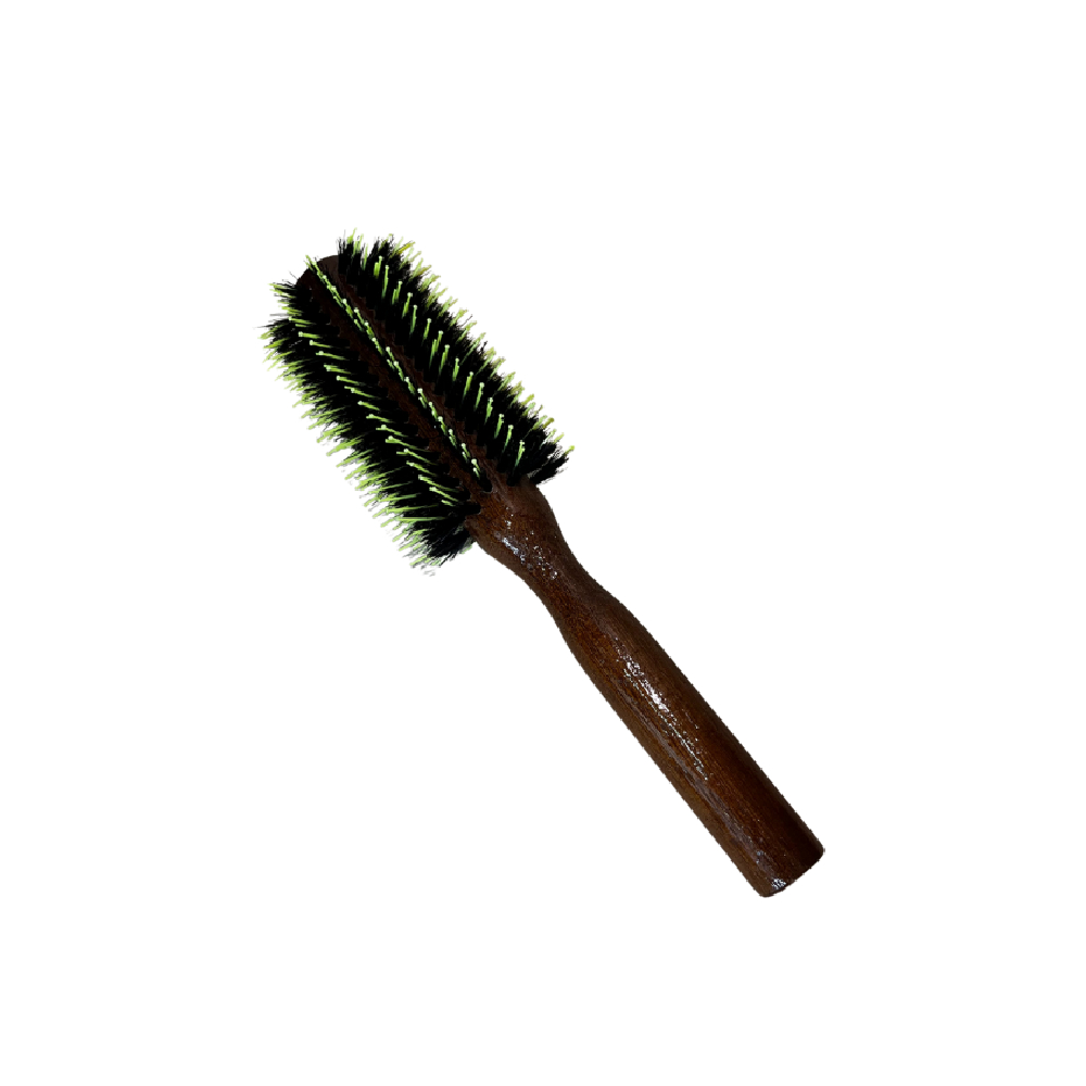 Escova redonda, com cabo em madeira, cerda em nylon 6.6 e cerdas naturais, aplicadas na diagonal. Ideal para alisar os cabelos em casa ou no salão. Dão movimento ao cabelo devido ao posicionamento diagonal das cerdas. Pode ser submetida ao calor do secador.