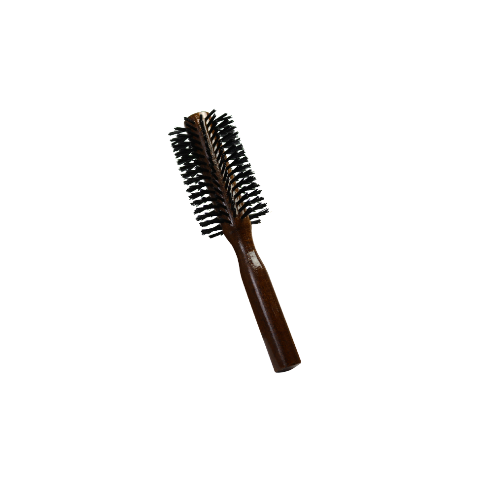 Escova redonda, com cabo em madeira, cerda em nylon 6.6 e cerdas naturais. Ideal para alisar os cabelos em casa ou no salão. Dão movimento ao cabelo devido ao posicionamento diagonal das cerdas. Pode ser submetida ao calor do secador.